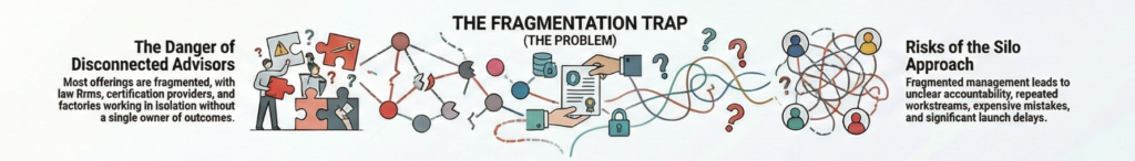 Most companies face a fragmented market: legal advisors, certification providers, factories, and GR consultants operate separately. The result is no single owner of outcomes, repeated workstreams, delays, and expensive mistakes.