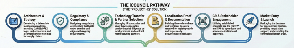 iCouncil is built as a project HQ: strategy → regulatory pathway → partners/production → localisation proof → stakeholder/GR track → market entry.